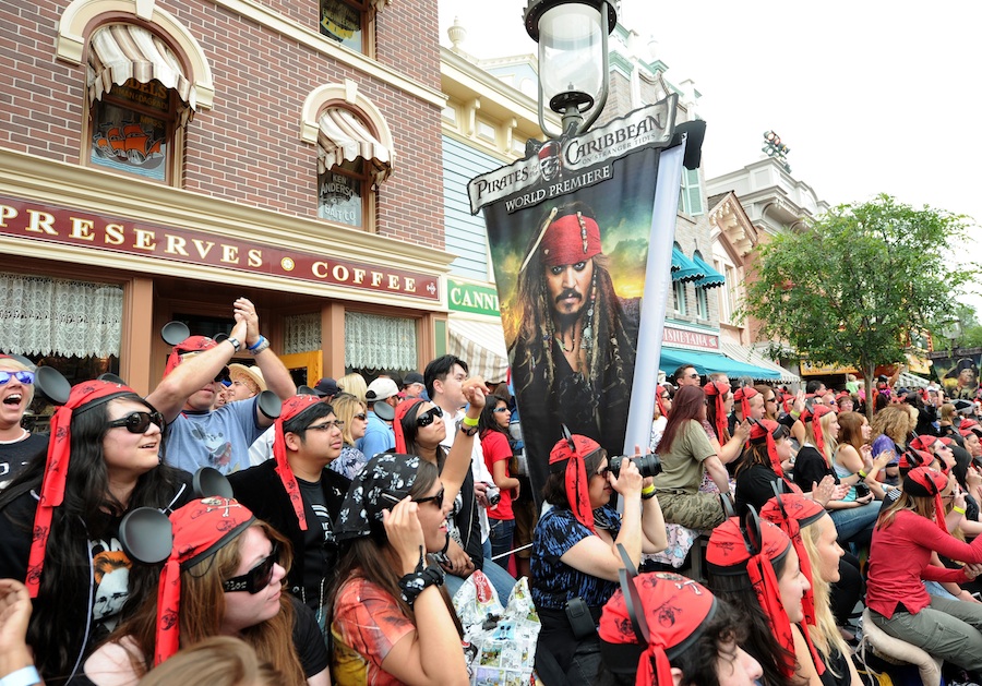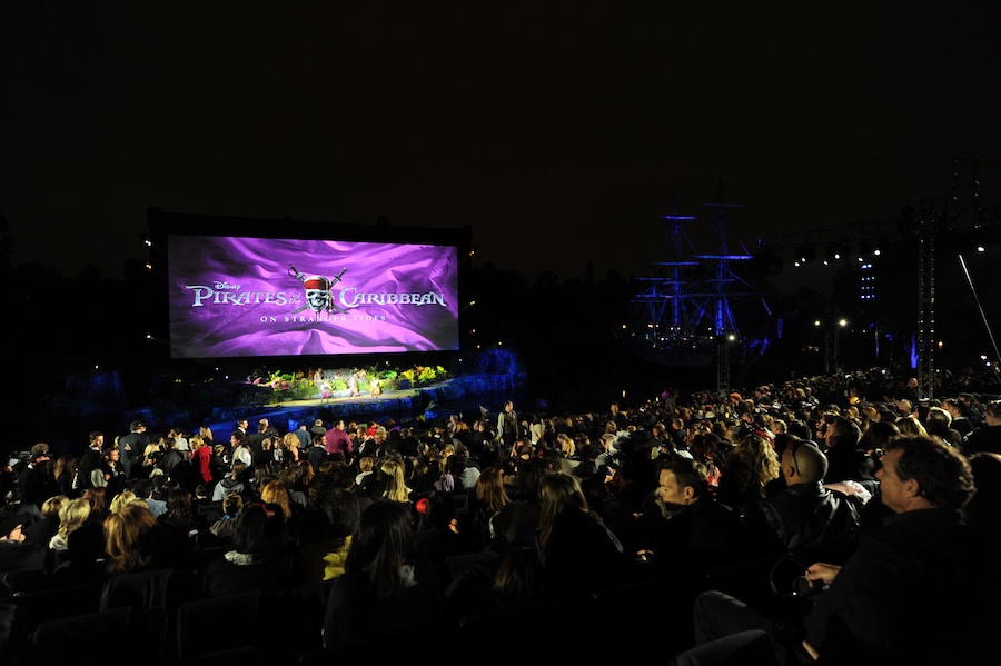 Los invitados al estreno debían dirigirse a New Orleans Square, donde obtenían los lentes 3D y les indicaban el camino hasta sus asientos muy cerca de la atracción en la que se basa esta saga. Como en todos los estrenos de Disney, antes de empezar la película, los protagonistas, incluyendo a Johnny Depp, Penelope Cruz, Ian McShane and Geoffrey Rush fueron presentados en un escenario especial construido en The Rivers of America.