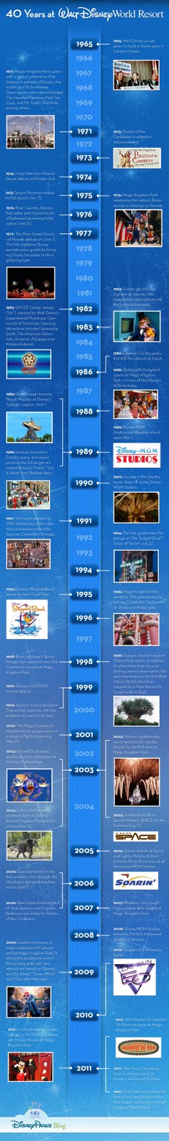 El pasado 1ro de Octubre se celebró el 40th Anivesario de Magic Kingdom y Walt Disney World, 40 décadas en la que han expandido, actualizado y construido más parques, y para tener una mejor idea de ese lento pero continuo proceso hoy les traigo una infografía de la línea de tiempo de la vida de WDW publicada por el blog oficial de Disney, luego del salto les dejo la infografía aunque está en inglés, es muy fácil de entender, espero que les guste saber un poco más de la vida de WDW.