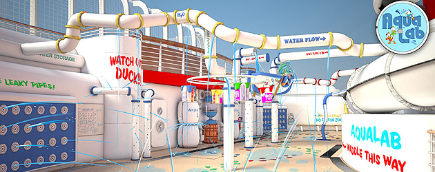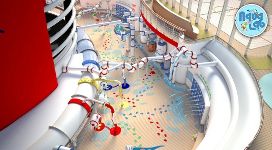 Luego del gran exito de AquaDuck en el Disney Dream, han decidido ampliar la zona de juegos en el Disney Fantasy, creando una zona que se llamará AquaLab, que según la historia, fue creado por Hugo, Paco y Luis, los sobrinos del Pato Donald, pero ellos lo han dejado abandonado, así que los huéspedes serán los encargados de mantenerlo operativo junto a AquaDuck, girando ruedas y activar palancas en tres zonas de aguas locas, tapando además con las manos una pared llena de agujeros por donde salen chorros de agua, asegurando mucha diversión para los pequeños de la casa. Además en la cubierta 12, existirá otra área donde las familias podrán relajarse, con una piscina y una fuente de cálida agua, ofreciendo amplios espacios con sillas y toldos para el disfrute de los huéspedes, luego del salto les dejo más imágenes.