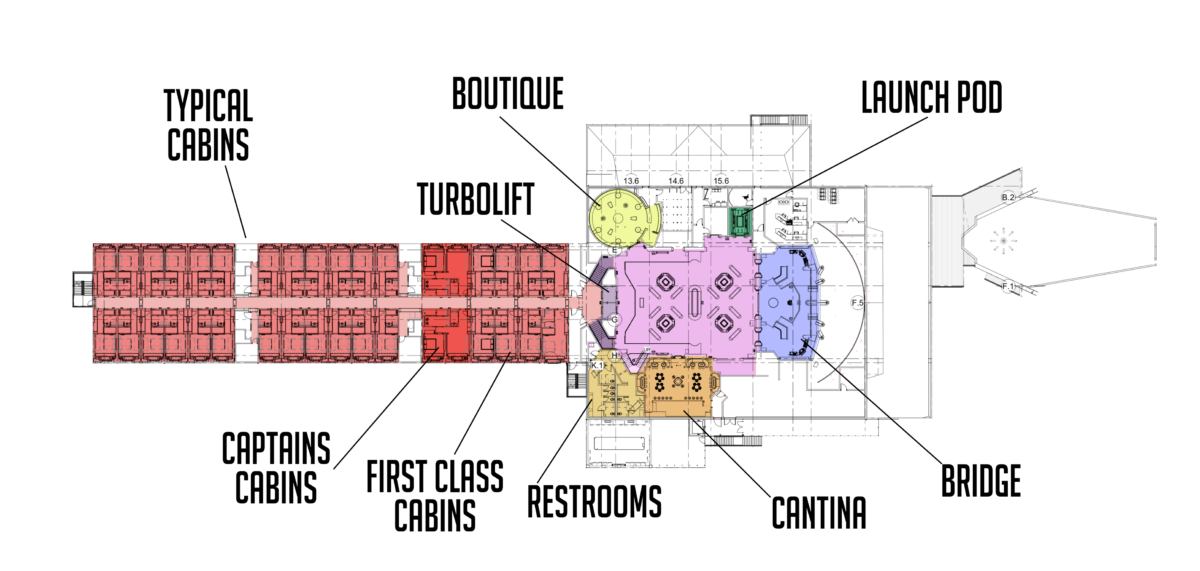 Luego al acoplarse las cápsula los huéspedes entran al Atrium, desde donde podrán accesar a las distintas zonas del Crucero Espacial como el Puente, la Cantina, una Boutique, Dojo de Sables Laser, restaurante y las habitaciones, además los visitantes podrán abordar unas cápsulas de transporte que los llevarán directamente al planeta Battu en Star Wars: Galaxy's Edge.