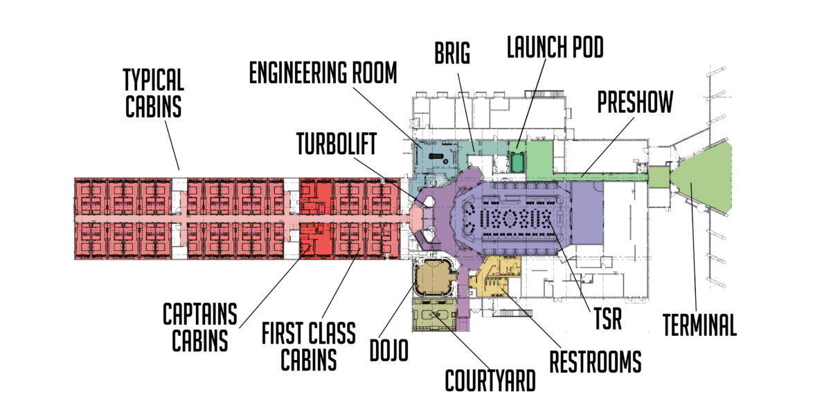 En el primer nivel podremos encontrar el terminal, el preshow de llegada, las capsulas de lanzamiento, el dojo de sables laser, habitaciones y más.