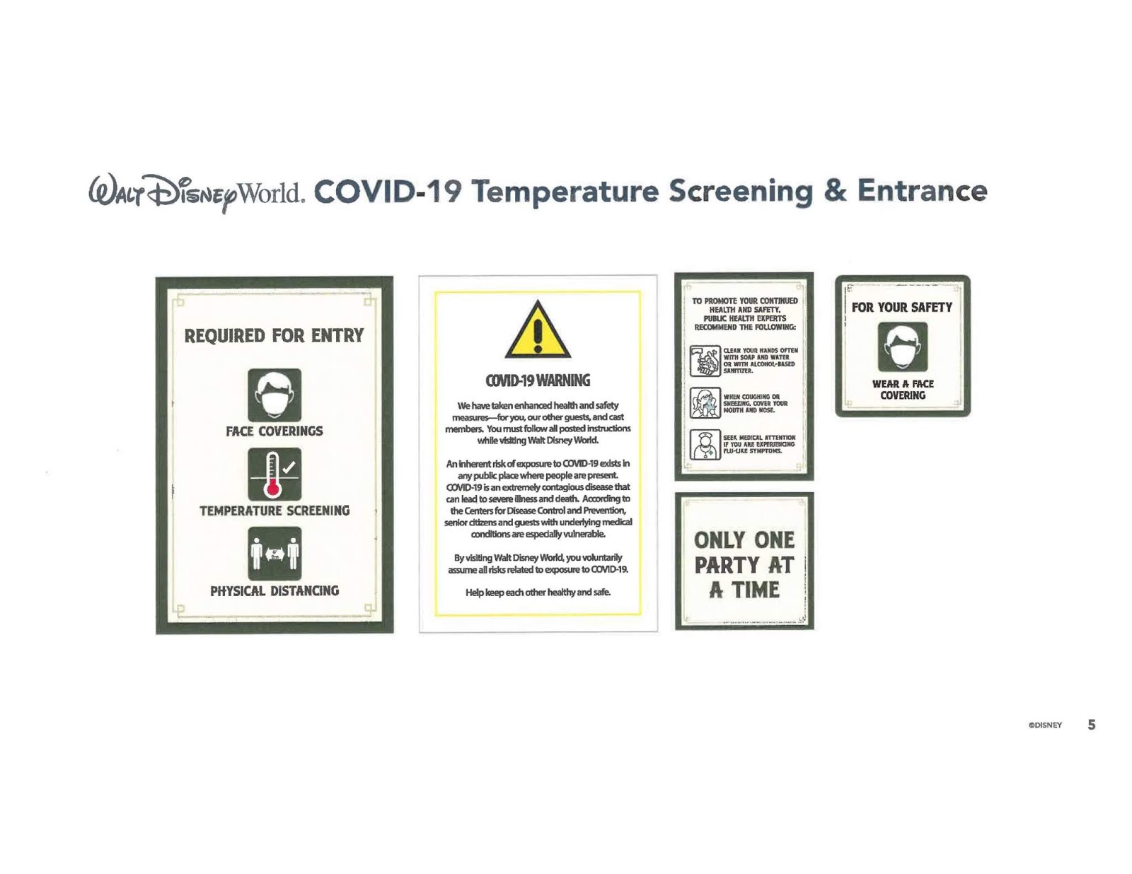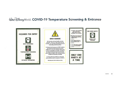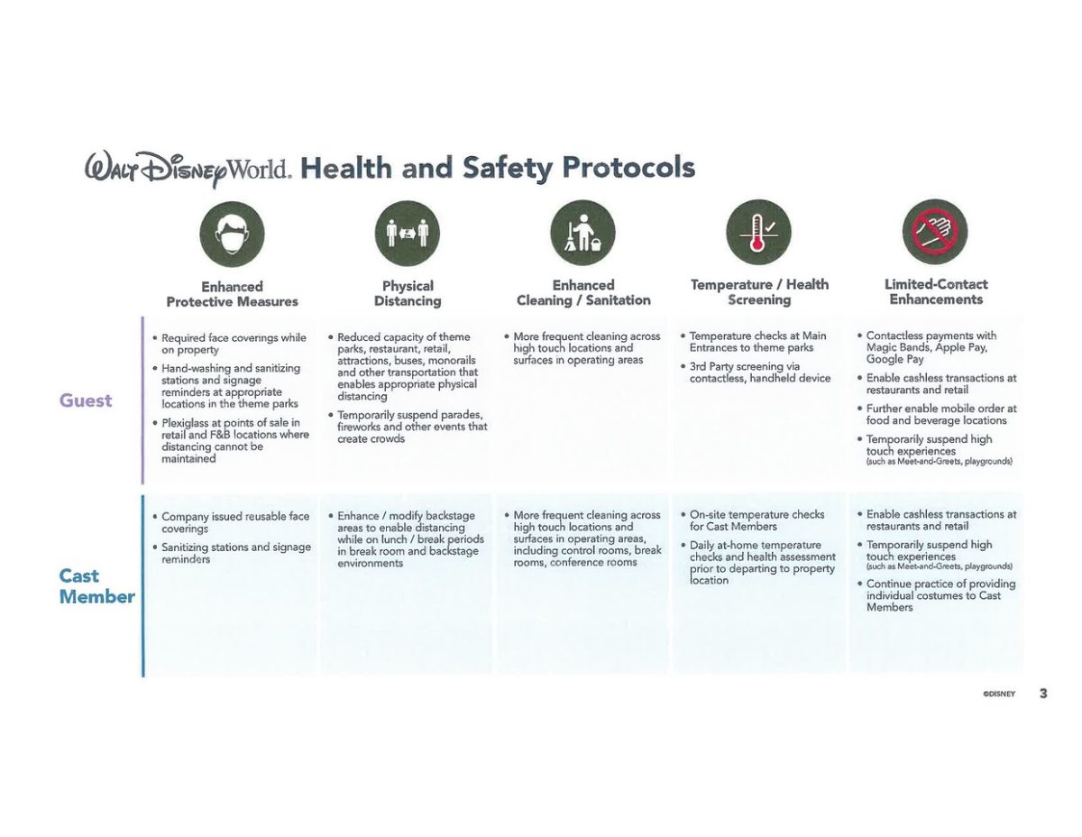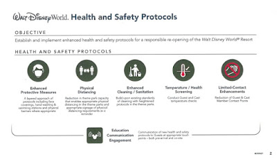 En ésta fase inicial los parques abrirán con capacidad limitada para luego ir aumentando la capacidad según vaya evolucionando las fases de reactivación aprobadas por la autoridades y será activado un sistema de reservas para poder accesar a los Parques como hicieron en Shanghai Disneyland, las medidas de distanciamiento social serán aplicadas, así como chequeo de temperatura al accesar a los Parques, dispensadores de gel antibacterial, estaciones para lavado de manos por toda la propiedad y el uso de mascarillas por parte de los visitantes y Cast Members será exigido, además van a designar unas "zonas de relajación" donde los visitantes podrán alejarse de las áreas principales y quitarse las mascarillas para poder respirar aire puro. También durante la reunión con las autoridades Disney presento algunos de los carteles que se podrán ver por los Parques para recordar las medidas de distanciamiento social.
